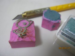左)消しゴムにデザインナイフ・彫刻刀で削っていきます。